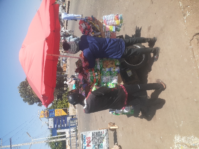 The image depicts an active street scene in Jos, Nigeria, under a clear blue sky. Two individuals are positioned around a mobile vendor cart, which is shaded by a large red umbrella. The cart is heavily laden with various packaged snacks, candies, and small consumer items displayed on its shelves and hanging from its sides. The individual on the left is wearing a black long-sleeved shirt with pink accents on the sleeves, black trousers, and open-toed sandals. The individual on the right is wearing a blue long-sleeved shirt, black trousers, black closed-toe shoes, and a white and grey knitted beanie; this person appears to be interacting with the merchandise on the cart. In the left midground, a white sign advertises "THE GREAT POS." Beyond it, a prominent blue and yellow "TOTAL" fuel station structure is visible, featuring multiple fuel pumps and a sign indicating "DIESEL." Overhead, utility poles support power lines and streetlights. The immediate ground surface is an unpaved, light-colored earth with scattered debris. In the background, a paved road extends into the distance, showing a person on a motorcycle, several pedestrians, and indistinct urban structures and green foliage.