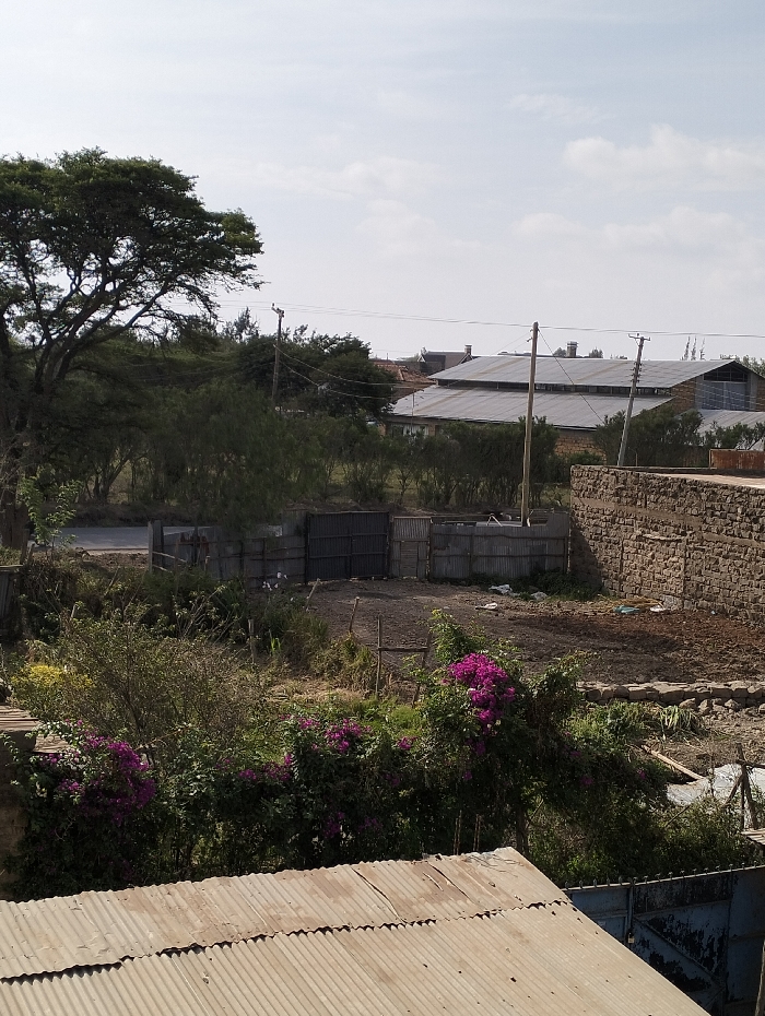 A sunny landscape features a corrugated metal roof in the foreground, leading to a garden with vibrant purple bougainvillea. Beyond lies a yard with a fence and a stone wall on the right. In the distance are industrial buildings with corrugated metal roofs and a row of power poles. A large tree stands to the left, partially obscuring a paved road. The sky is lightly overcast.