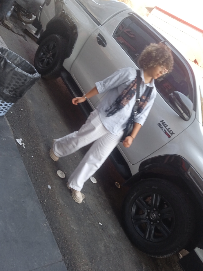 A forensic description of the scene in Barza Municipality, Syria depicts a young person walking outdoors alongside a parked, light-colored (likely white or silver) Toyota Hilux pickup truck with a bed cap. The individual, of indeterminate gender, possesses curly brown hair and wears round glasses, a light blue and white striped button-up shirt with rolled-up sleeves, white pants, and tan, chunky-soled shoes. A dark patterned scarf is draped around their neck, and a dark shoulder bag with a visible strap is worn across their body. A silver-colored bracelet is visible on their left wrist. The person's body is angled, suggesting forward movement. The Toyota Hilux features black fender flares and black multi-spoke wheels. "HILUX" and "DIESEL" badging are visible on the passenger side. The ground beneath the person and vehicle is dark gray asphalt or concrete, scattered with debris including white paper scraps, cigarette butts, and several round, light-colored objects. To the immediate left, a portion of a dark gray or black rectangular object, possibly a trash receptacle or street fixture, with a textured, perforated surface, is visible. In the upper left background, behind the Hilux, a wheel and fender of another vehicle, possibly a motorcycle, are partially discernible. The background on the right features a reddish-brown building or wall under daylight conditions. The image is captured at an oblique angle, creating an illusion of a sloped ground plane.