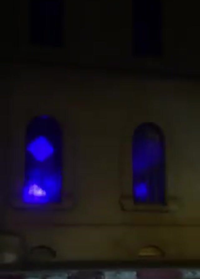 building at night. The building has four windows, two small ones on top and two larger arched windows below. All of the windows are illuminated with a bright blue light. Cars drive by on the street in front of the building.