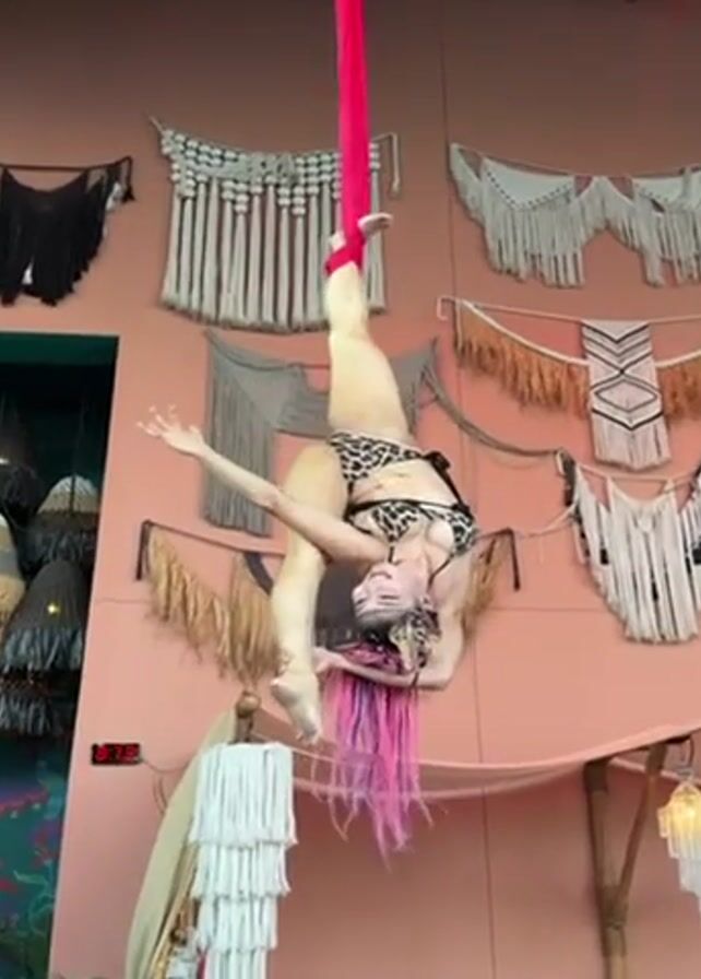 A woman is performing aerial acrobatics on a red fabric, suspended in the air. She wears a leopard-print bikini and has pink hair extensions. She is upside down, with one leg straight up in the air and the other bent. The background is a pink wall decorated with various macramé wall hangings. There are also some hanging light fixtures and plants visible. The clock reads 19:52.
