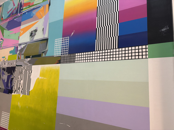 The image displays an abstract, multi-panel painting or mural rendered in a geometric and fragmented style, observed from a slightly elevated, oblique angle