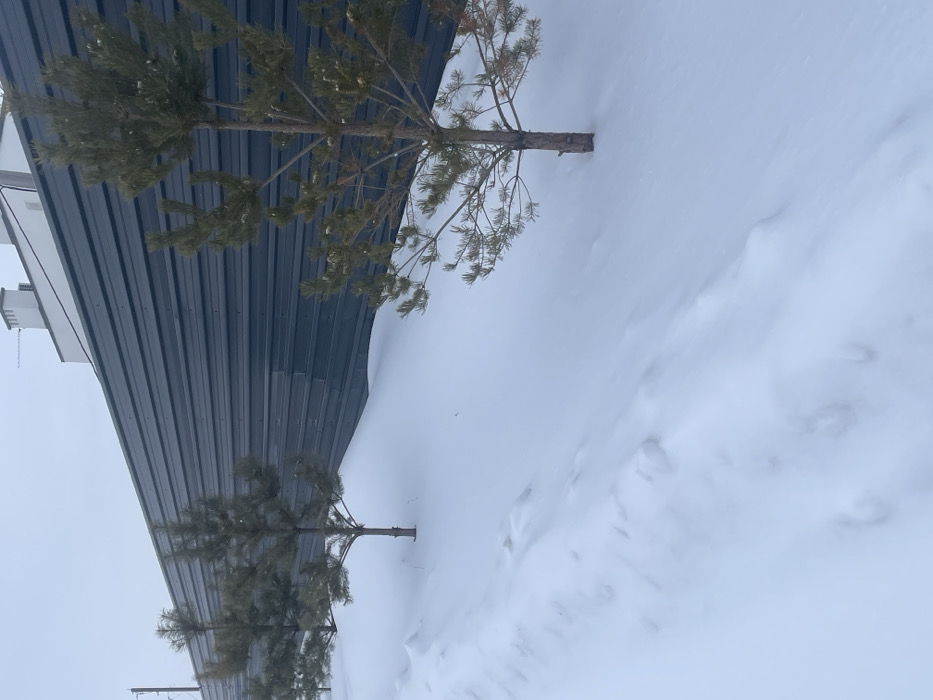The image displays an outdoor winter scene in Podstepki, Russia. A substantial dark gray corrugated metal fence extends horizontally across the mid-ground, acting as a boundary. Behind this fence, a white building with a pitched roof and at least two distinct white chimneys is visible against an overcast, light gray sky. In front of the fence, a row of at least three young, green conifer trees are rooted in deep snow, which covers the ground entirely and forms drifts against the fence line. The foreground consists of a snow-covered surface, featuring a subtle, elongated depression or disturbed area that runs parallel to the fence. No individuals, animals, or explicit actions are present within the frame.