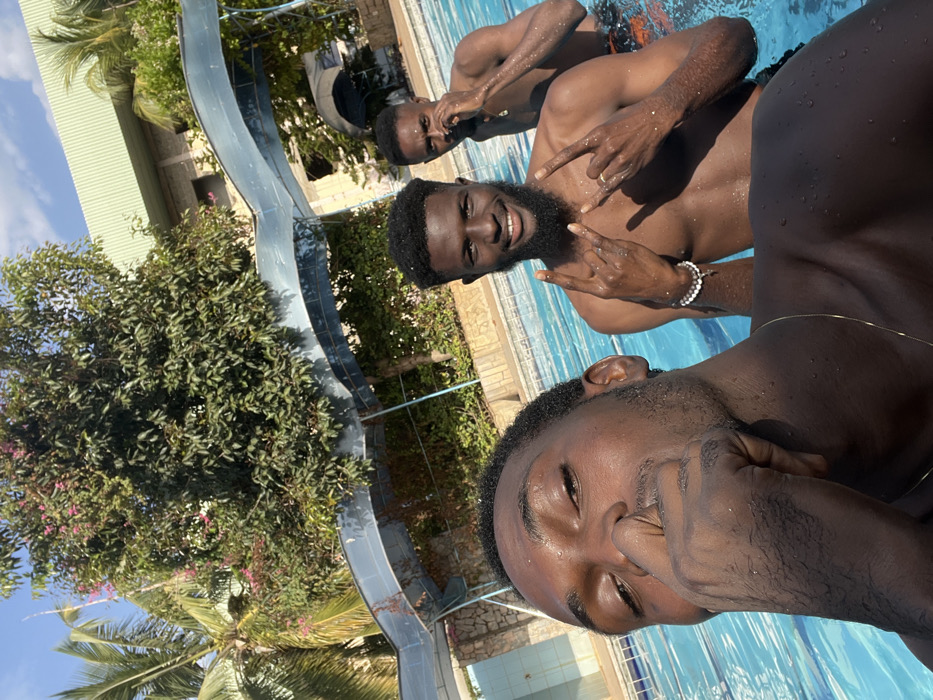 Three young adult males are depicted in a swimming pool in Unguwar Rimi, Nigeria, under bright daylight