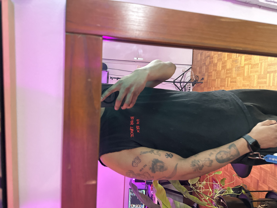 A mirror selfie reveals a person in a black t-shirt with red lettering, partially obscuring their face. Visible skin displays multiple tattoos. The background includes a room with a wooden floor, visible cords, a white wall, and what appears to be a plant in front of a computer screen. The mirror has a wooden frame, with pink lighting reflected on the adjacent wall.