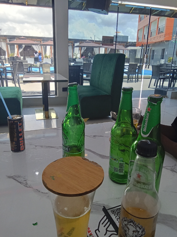 table with four bottles of beer, one can of beer, and a glass of beer with a wooden coaster on top. The bottles of beer are Heineken, and the can of beer is Bullet. The table is made of white marble. There is a large window behind the table, and an outdoor area can be seen through it. The outdoor area has tables and chairs, and a swimming pool. The image is taken from a low angle, so the table and the beer bottles are in the foreground. The window and the outdoor area are in the background. The image is taken in a cafe or restaurant. There is a green chair and a green couch in the background, as well as a window to the right. There is a large, light orange building in the background through the window. The image is taken in a building at an unknown location, as the latitude and longitude provided are invalid.