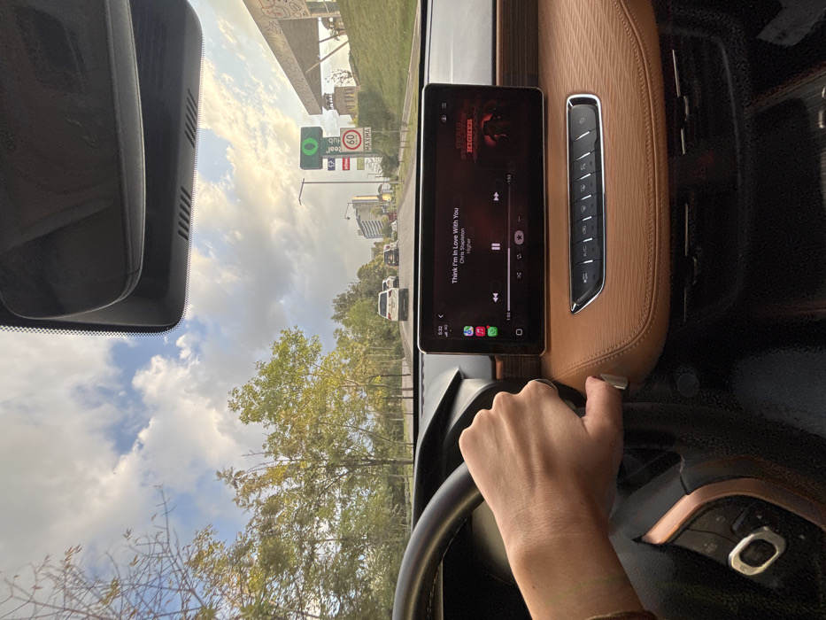 The image depicts an interior view from a vehicle in Interlomas, Mexico, looking forward through the windshield. A person's right hand with a ring on the ring finger and a bracelet on the wrist is positioned on the black steering wheel. The vehicle's dashboard is trimmed with brown textured material and features a large, central infotainment screen displaying music playback: "Think I'm In Love With You" by Chris Stapleton, from the album "Higher," with the time 5:32 shown. Below the screen, a row of climate and control buttons is visible. Outside the vehicle, a multi-lane paved road slopes gently upwards, with a line of vehicles, including a white SUV, traveling in the same direction. Lush green trees and foliage line both sides of the road. On the right side, a tall green sign displaying a white 'O' logo and "Real Club" text, alongside a red circular "60" km/h speed limit sign with "MAXIMA" below it, is visible. Adjacent to the sign, a building with traditional architectural elements, featuring arches and a domed structure, is partially visible on a grassy embankment. Further in the distance, modern urban buildings are discernible under a partly cloudy sky with patches of blue and visible sunlight.