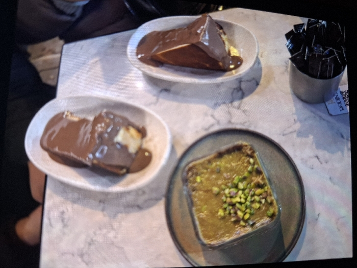The image depicts a tabletop scene within an establishment in Selyanin, Bulgaria. The surface is a light-colored, possibly marble-patterned, table. Three dessert items are prominently displayed. On the left, a square-shaped dessert, possibly Kunefe or similar, with a greenish-yellow top layer covered in chopped pistachios, is presented in a rectangular dish placed on a dark-rimmed plate. To the right, two oval-shaped white dishes each contain a portion of light-colored cake or pastry completely coated in dark brown chocolate sauce or ganache. Below the rightmost chocolate dessert, a light grey cylindrical container is filled with numerous individually wrapped black sachets, likely sugar packets. A small white rectangular card displaying the text "RODIN" and a QR code is visible near this container. Portions of human limbs are partially visible in the upper and right edges of the frame, suggesting individuals are seated around the table. No direct actions or interactions are visible, but the setup indicates a dining or dessert-consuming activity.