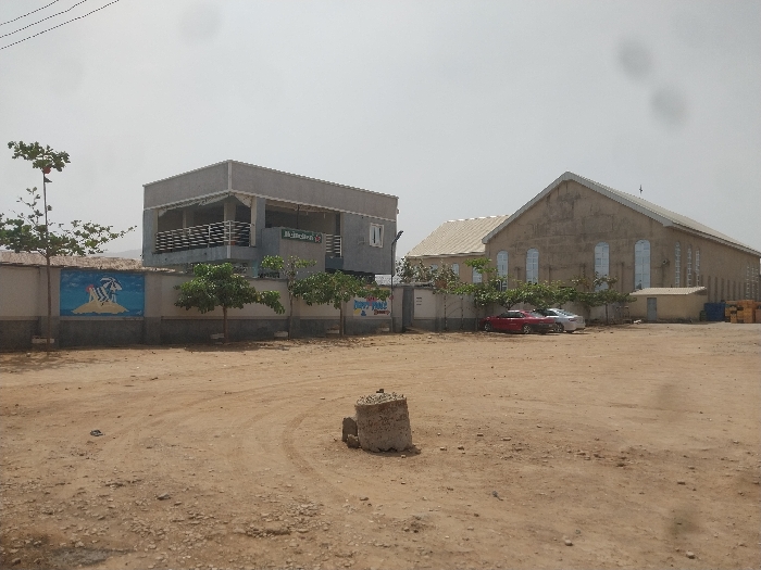 The image displays an outdoor scene in Bauchi, Nigeria, under a bright, hazy sky. The foreground is composed of dry, light-brown, unpaved ground with visible tire tracks and scattered debris. A concrete block, partially embedded in the earth, is located in the lower-center. In the midground, a light-colored perimeter wall runs horizontally, featuring a painted mural on its left section depicting a beach scene with a person under an umbrella. Several small trees with green foliage are planted along this wall. Behind the wall to the left, a two-story building with a grey exterior and a flat roof is visible. The upper floor includes a balcony with horizontal railings, and a green sign displaying "Heineken" is affixed to its facade. To the right, a large, light-colored building, resembling a church with a pitched roof and multiple arched windows, dominates the view. Two passenger cars, one red and one white/silver, are parked in front of this building. A small, light-colored shed is positioned adjacent to the right side of the larger building, and stacks of yellow-colored materials are visible further to the right. No individuals are present in the scene.