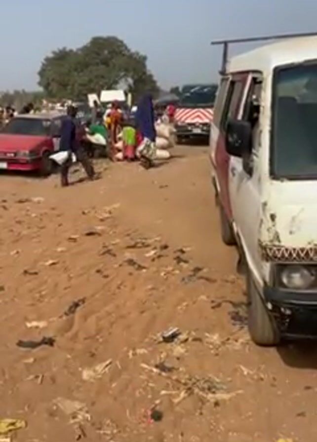 crowded outdoor market on a dirt surface littered with trash. Several people are visible, some carrying large bags, possibly of goods for sale or purchase. Vehicles are present, including a white and red van parked on the side and other vehicles further in the background. The sky is visible and appears clear. The overall impression is that of a busy and somewhat disorganized marketplace.
