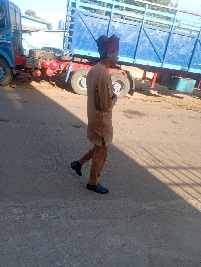 An adult male is captured mid-stride, walking left to right on an asphalt road under clear daylight in Jos, Nigeria. He wears a brown long-sleeved tunic with embroidered pocket details, matching trousers, a maroon traditional cap, and dark dress shoes. His right foot is raised, and his hands are clasped in front of him as he looks towards the left. In the background, a blue heavy-duty truck trailer with a red chassis is stationary to the man's right, and the front portion of a blue and red truck is partially visible to his left. Strong sunlight casts distinct shadows, including the man's shadow and a shadow resembling a fence on the road's right side. Distant structures, including one with a light blue water tank, are visible under a bright sky.