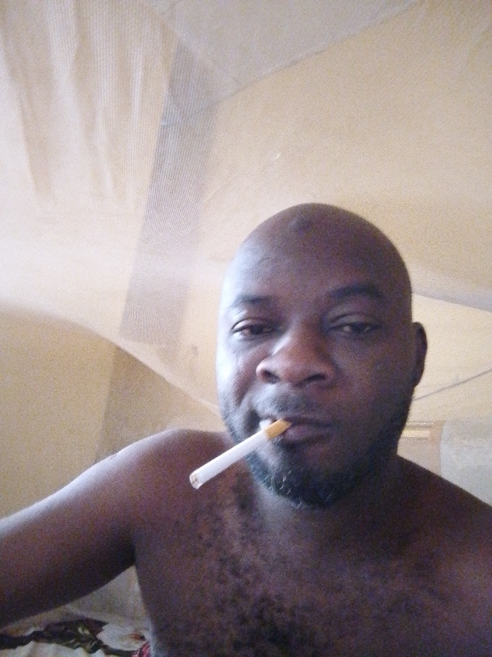 An adult male is depicted indoors in Babban Giji, Nigeria. He is dark-skinned, bald, and has a short beard and mustache. He appears shirtless, with visible hair on his chest and left shoulder. A white cigarette with an orange filter is held horizontally in his mouth. The man is looking directly at the camera. Above and behind him, a translucent, light-colored mosquito net is visible, creating vertical and diagonal folds against a light-colored wall or ceiling. A small section of patterned fabric is discernible in the lower-left corner of the frame.