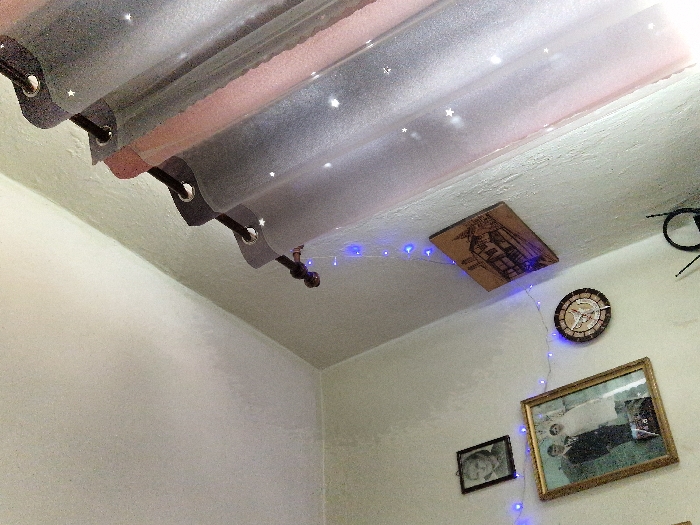 An interior corner of a room in Raduvene, Bulgaria, is captured from a low, upward-angled perspective. The walls are textured and painted a light, off-white hue, meeting a smooth, off-white ceiling. On the right, a set of curtains is suspended from a dark rod with metallic grommets; these consist of an outer sheer grey layer embellished with small white star-like patterns, backed by an inner pink or light reddish-brown panel. A string of blue LED lights is draped diagonally across the walls, originating near the curtain rod and extending towards the lower left. Two framed pictures are hung on the left wall: a smaller, dark-framed portrait of an older woman at the top, and a larger, gold-framed wedding portrait depicting a man in a dark suit and a woman in a white gown below it. To the right of the wedding portrait, a circular wall clock with a light-colored, possibly wooden, face and dark hands is affixed. Further to the right and slightly higher, a square wooden plaque featuring a dark engraved or depicted image of a building hangs on the wall. A portion of a black, abstract object, possibly an electronic device or its stand, is visible in the bottom right corner. No live individuals are present in the immediate scene; human subjects are confined to the framed photographs.