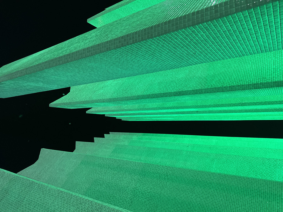 A low-angle, upward-looking photograph captures multiple tall, slender architectural structures illuminated with a vibrant emerald green light against a pitch-black night sky. These structures are identified as architectural features of the Ho Chi Minh Museum (Nha Rồng Wharf) in Ho Chi Minh City, Vietnam. Their facades are composed of small, uniformly textured, rectangular units, resembling bricks or tiles, forming a grid pattern across their surfaces. The structures exhibit irregular, jagged top edges and a pronounced vertical orientation, creating a converging perspective toward the dark zenith. No individuals, vehicles, or natural elements are visible. The scene is static and devoid of direct human or object interaction.