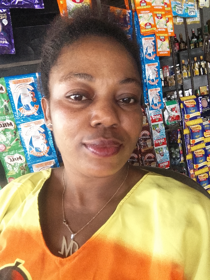 This image depicts a close-up portrait of a single adult female in what appears to be a small retail shop or provision store in Usiefrun, Nigeria