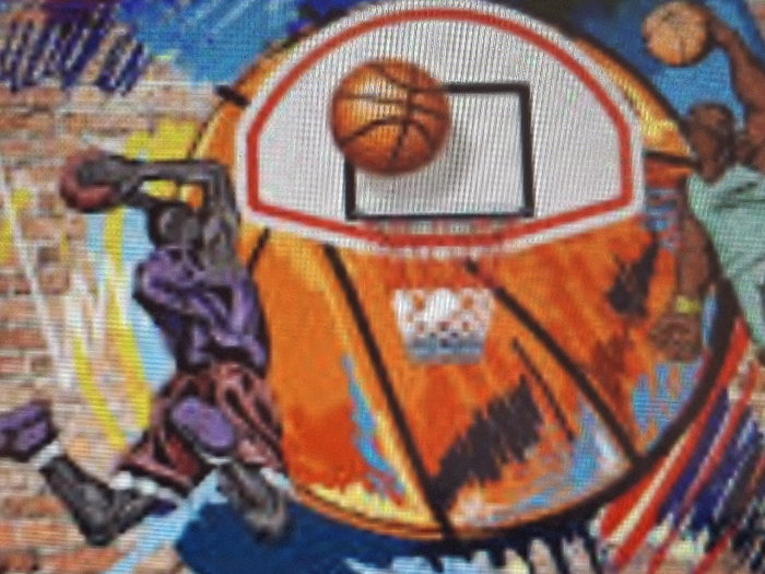 - "The image displays a vibrant, stylized mural or artwork with a basketball theme, located in Kafr Sousa Municipality, Syria" by FM-niJg42, licensed under CC BY 4.0
