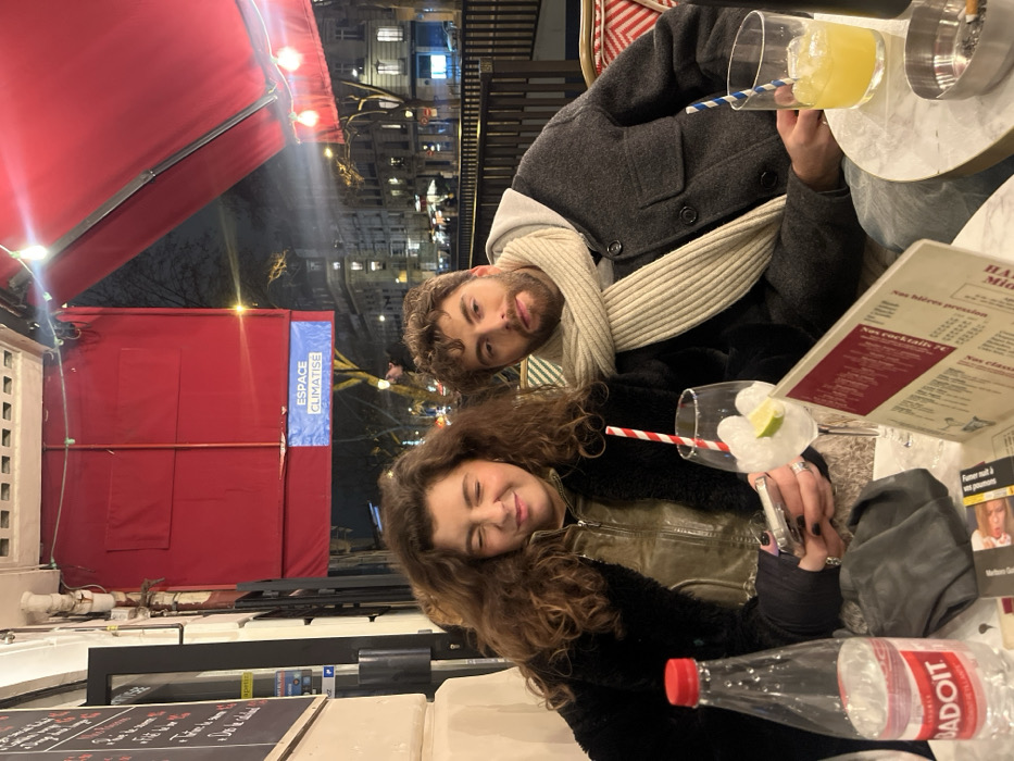 Two people are sitting at a table in an outdoor setting, likely a restaurant. The man, with curly hair and a scarf, has a drink with a blue and white striped straw. The woman, with curly hair, has a drink with a red and white striped straw. A menu and a water bottle are on the table, along with an ashtray. A red awning is visible above them. Building lights are visible in the background.