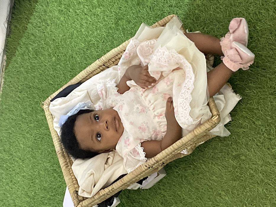 - "An infant is positioned within a light brown woven wicker basket, lined with bunched cream-colored fabric" by FM-PjuW22, licensed under CC BY 4.0