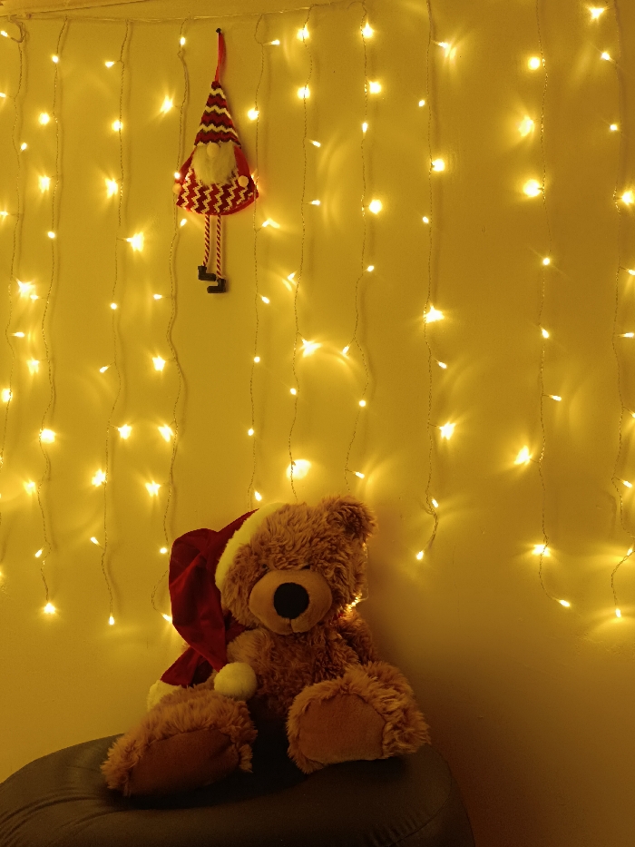 A plush teddy bear wearing a Santa hat sits on a dark, rounded surface. Behind the bear, a wall adorned with strings of small, warm-toned lights creates a bokeh effect. A small, hanging gnome-like ornament with a red hat and striped legs is positioned higher on the wall, adding to the festive, cozy atmosphere.