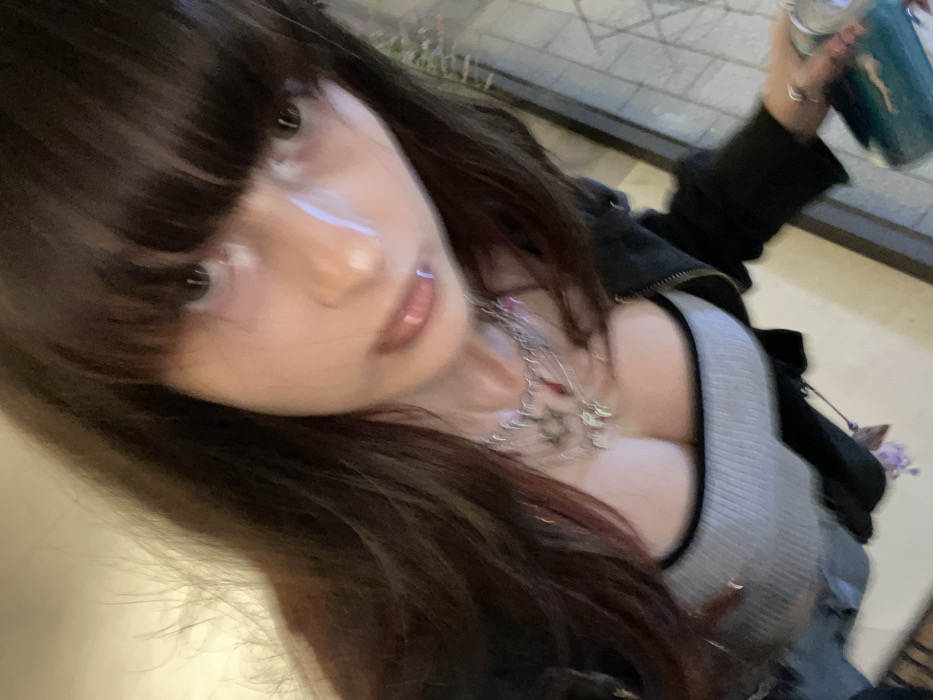 A low-angle selfie featuring a young woman with long, dark hair and bangs. She wears a gray tank top and a black jacket, accessorized with a layered silver necklace. She holds a green and blue can in her raised hand. The background shows an outdoor setting with a hint of greenery and a light-colored surface. Her face is well-lit, showcasing her fair skin, dark eyes, and glossy lips.