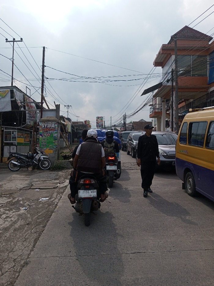 The image depicts an urban street scene in Sandamal Eliya, Sri Lanka, under an overcast sky. In the foreground, a dark-colored scooter, bearing license plate F 2196 WBH, is ridden by an individual wearing a white shirt and a brown quilted vest, viewed from behind. Directly behind this, a second scooter is partially visible, with its license plate F 5803 WQC partially legible. To the right of the scooters, a male adult dressed in a dark uniform with a cap walks forward on the asphalt road, positioned alongside a queue of dark-colored passenger vehicles, including a silver SUV. A yellow and blue public transport van is partially visible on the far right, positioned next to the walking man. The left side of the street features multiple utility poles supporting a dense network of overhead power and communication cables. Below these, several rudimentary commercial structures or stalls are present, one displaying "SYIFA" on a banner and another advertising "DIMSUM." Two motorcycles, one white and one black, are parked on the unpaved shoulder area. The right side of the street is defined by a multi-story building with an orange-brown tiled roof and light orange exterior walls. The asphalt road surface exhibits minor cracks and seams. The background reveals additional buildings, utility infrastructure, and billboards, suggesting a bustling urban environment. No direct interactions between individuals are discernible.