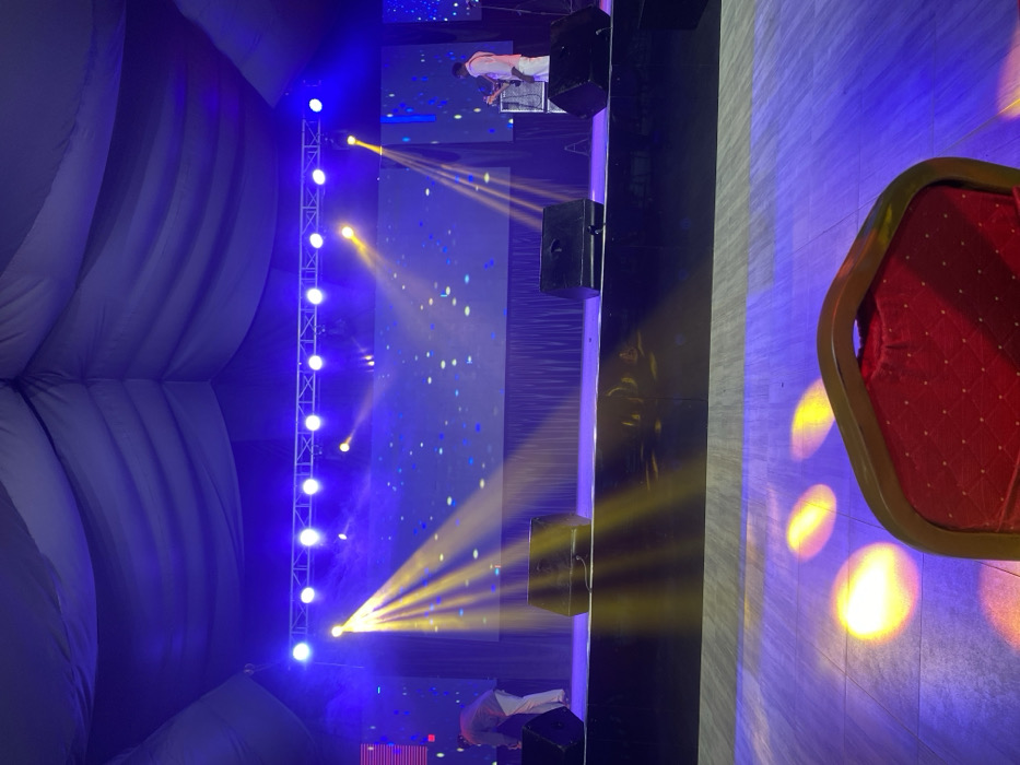 The image displays an indoor event stage within an event venue in Abuja, Nigeria