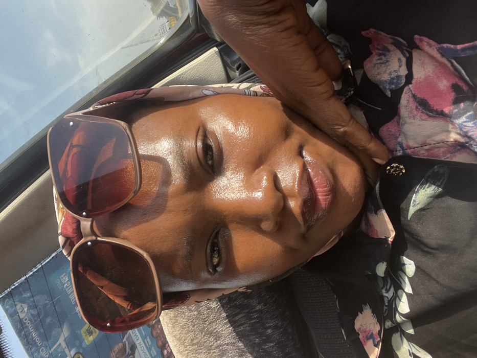 The image displays an adult female with dark skin, captured in a selfie inside a vehicle in Kugbo, Nigeria