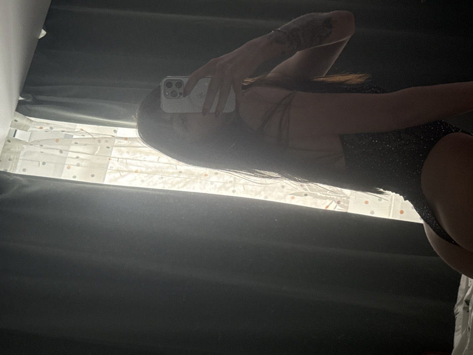 An individual is depicted indoors, taking a mirror selfie in Chaikovsky, Russia. The subject, likely female, has long dark hair and is positioned with their back partially turned towards the camera, looking over their right shoulder. They are wearing a dark, form-fitting bodysuit or leotard adorned with glitter. A tattoo is visible on their left upper arm. The individual's face is obscured by a light-colored smartphone, possibly an iPhone, which is held in their right hand, revealing red nail polish. The background features a window with sheer, light-colored curtains displaying small, multicolored polka dots, flanked by closed dark curtains. Bright natural light emanates from the window, silhouetting the subject. A white-covered surface, consistent with bedding, is visible in the lower left foreground.