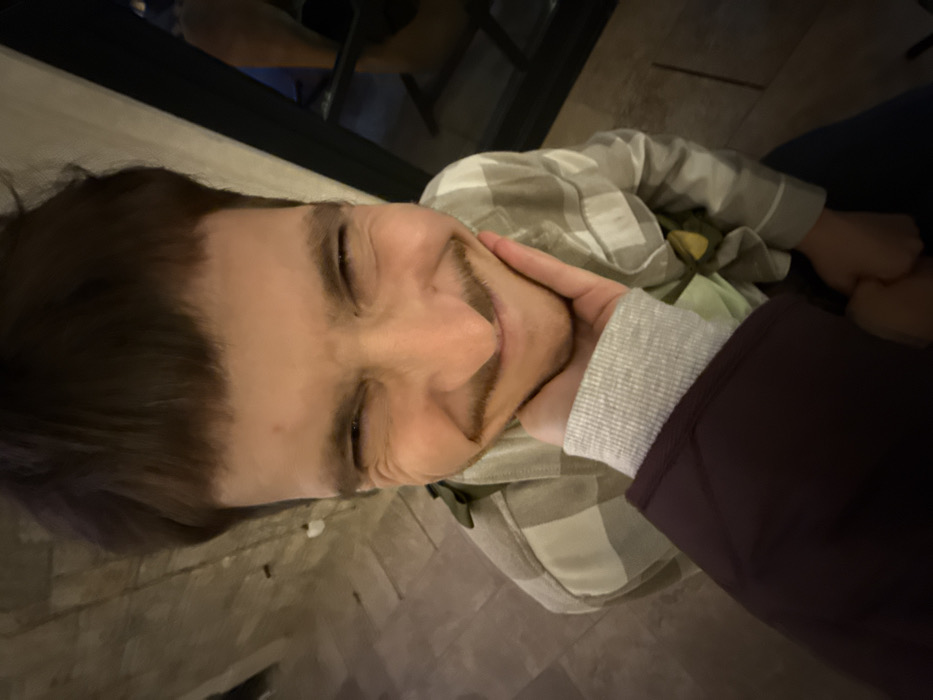A downward-angled photograph captures an adult male from the mid-torso upwards, with his head slightly elevated. He has short, medium-brown hair with a straight fringe, a light moustache, and a broad, closed-mouth smile with eyes tightly squinted, exhibiting visible crow's feet. He is dressed in a light-toned plaid long-sleeved shirt, a dark strap crosses his upper left torso, and a small, yellowish-green fabric item is knotted near his lower left ribcage. Dark trousers are visible below his waist. In the foreground, a left hand, wearing a light grey ribbed cuff and a dark purple jacket sleeve, gently cups the male's chin. The immediate environment includes a light-colored tiled floor with a brick-like pattern below and to the left of the male. A textured light brown wall is visible in the upper left background, while a dark vertical frame on the right reveals a blurred, reflective surface beyond. This scene is situated in the city of Rafailovići, Montenegro.