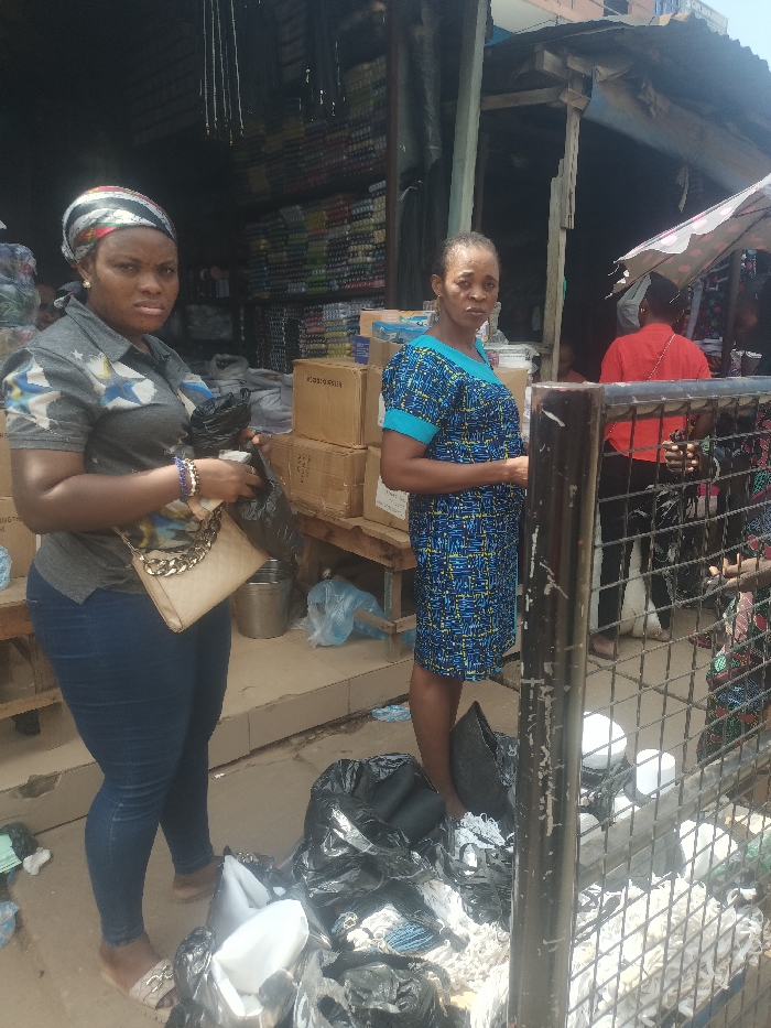 Two women stand in the foreground of a market scene in Unguwar Kaya, Nigeria. The woman on the left, wearing a grey patterned shirt, dark blue jeans, and a striped headscarf, holds a black plastic bag and a light-colored shoulder bag with a gold chain strap. She has blue beaded bracelets on her left wrist. The woman on the right wears a blue patterned short-sleeved dress with a light blue V-neck. Both women face the camera. Behind them, a wooden counter holds multiple brown cardboard boxes. Further back, a market stall displays shelves stocked with numerous multicolored packaged goods. A metal grate or fence post partially obscures the right side of the frame. The ground in the foreground contains black plastic bags filled with various items, some white, and a metal container. A person in a red shirt is partially visible in the deeper background to the right. The overall setting is an outdoor or semi-enclosed market under bright daylight.