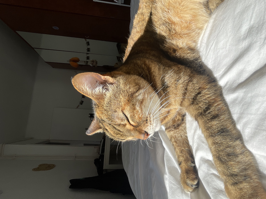 - "The image captures a domestic tabby cat, predominantly orange-brown with darker stripes, resting on a white-sheeted bed within a residence in Canet de Mar, Spain" by FM-T5EOT2, licensed under CC BY 4.0
