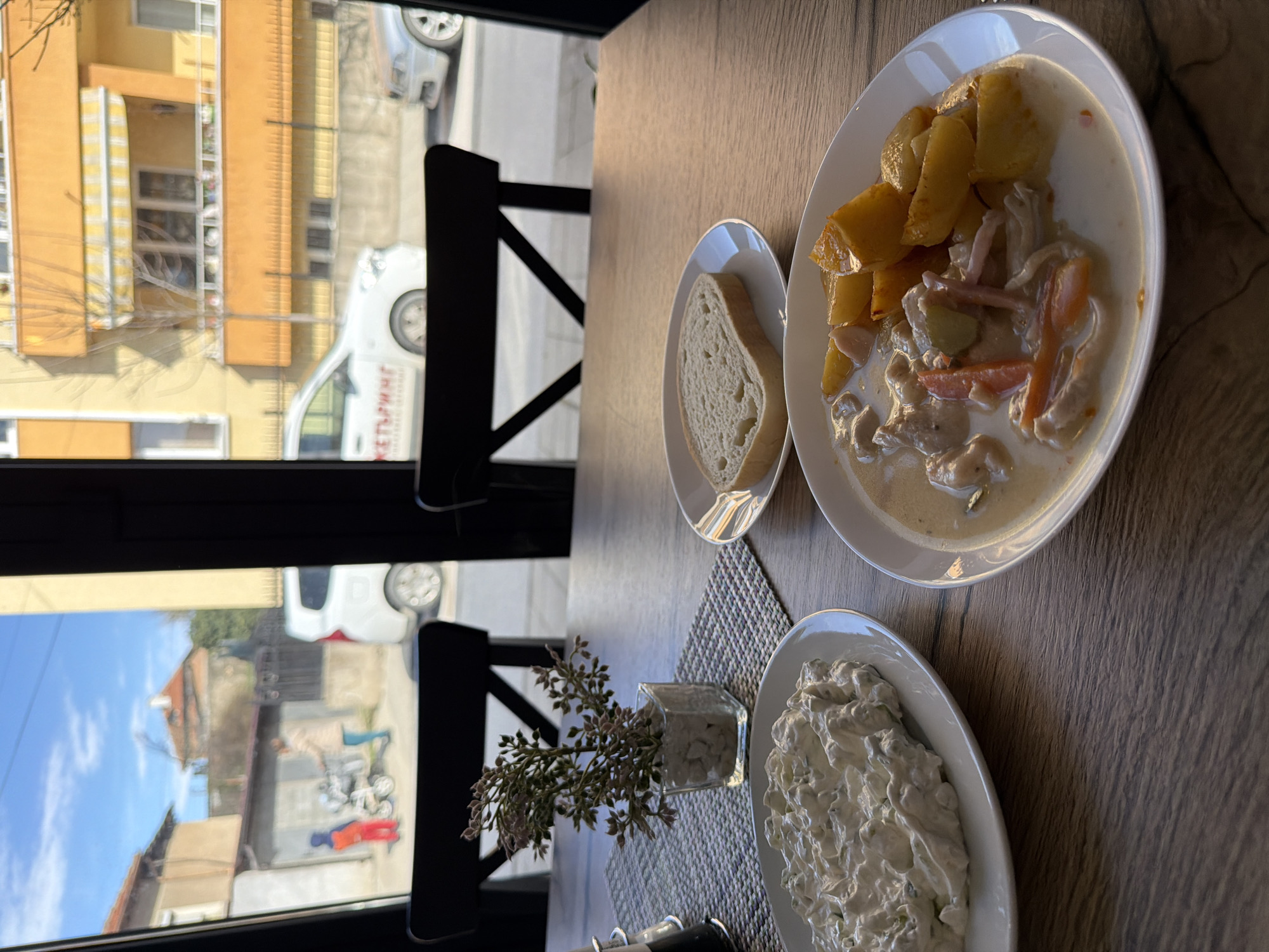 The image captures a lunch setting at a restaurant, likely in Panagyurishte, Bulgaria, as suggested by the Cyrillic text visible on a vehicle outside the window. A wooden table is set with a plate of chicken stew with potatoes, a plate with a slice of bread, and a plate of salad, potentially Shopska salad or another cucumber-based salad. A small vase with artificial flowers adorns the table. The window offers a view of a street scene with buildings and vehicles, indicating an urban environment. The time of day appears to be daytime due to the natural light.