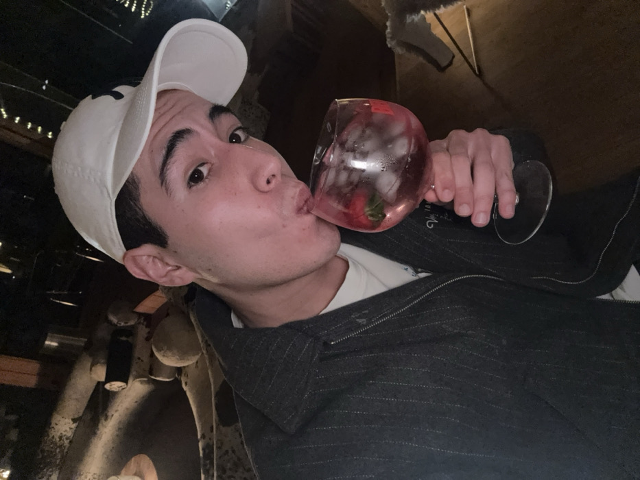 A man in a white baseball cap drinks from a large glass containing liquid, ice, and a strawberry. He wears a charcoal gray jacket over a white shirt. The setting is dimly lit, with what appears to be machinery in the background. The camera angle is low, tilted upwards towards the man.
