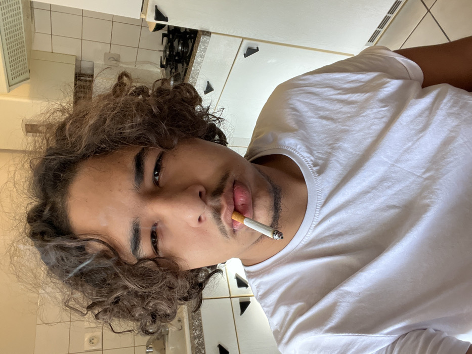 The scene is an indoor residential kitchen in Sarreguemines, France. A male individual with medium-brown curly hair, a light mustache, and a small goatee is depicted in a close-up, facing the camera. He wears a plain white short-sleeved t-shirt. A lit cigarette, exhibiting a visible ember and a faint wisp of smoke, is positioned between his lips. The background features white tiled walls, white upper and lower cabinets with dark pull handles, a sink with a faucet on the left, and a speckled countertop. A gas stove with visible burners is situated on the right side, surmounted by a white range hood. A segment of a white refrigerator is observable on the far right.