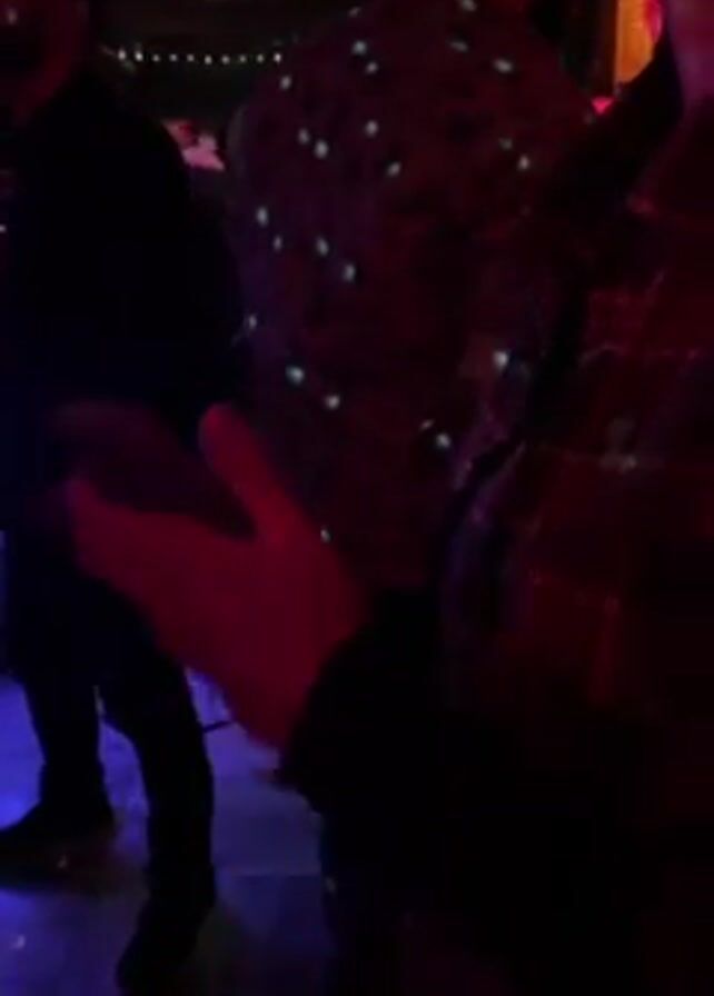 The video depicts a person in a green plaid jacket using a smartphone in a crowded, dimly lit nightclub or bar