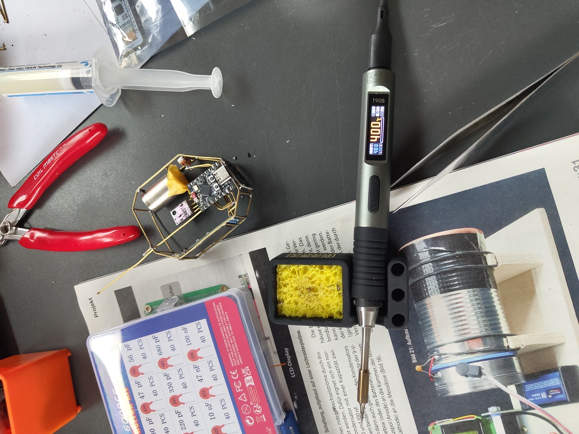 This image depicts a cluttered workbench, likely within a workshop in Mettlach, Germany, featuring an ongoing electronics project. The central focus is an assembly of electronic components on a dark gray surface, partially overlaid on open German-language magazine pages. Prominent objects include a powered T190B soldering iron, set to 400 degrees Celsius, resting on a black stand next to a yellow, wet cleaning sponge. To the upper left, a clear plastic container labeled "Goodpec CAPACITOR KIT" displays various capacitor values and quantities. Above it, an orange storage bin is partially visible. Further right, a pair of red "Coil Master" wire cutters lies next to a gold-colored, open-frame structure containing a small circuit board, a cylindrical battery, and a yellow component, with a thin wire antenna extending upwards. A translucent syringe, possibly containing solder paste or flux, is positioned nearby. On the magazine pages below the soldering station, a DIY project is visible, consisting of a metallic can, partially wrapped in black tape, mounted on two small wooden blocks. Wires and a 9V battery are connected to this assembly. The magazine text discusses "Projekt," "LCD-Display," "Lochrasterplatine" (perforated board), and "Aufbau" (assembly), indicating an electronics hobbyist context. The scene suggests an active state of component assembly or repair.