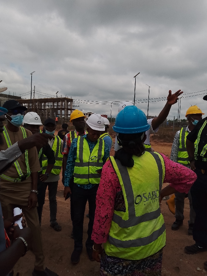 The image displays a group of approximately ten to fifteen individuals gathered on a reddish-brown earth surface at a construction or development site in Lokoja, Nigeria, under a heavily overcast sky. Most individuals are equipped with fluorescent yellow/lime green safety vests, often featuring reflective strips, and hard hats in white, yellow, or blue. Several individuals are also wearing face masks. In the immediate foreground, a female individual, seen from behind, wears a blue hard hat, a fluorescent yellow safety vest with "OSABO NIG LTD" emblazoned on the back, a bright pink lace long-sleeved top, and a patterned skirt. To the left, a male individual in a light brown traditional garment, black cap, and face mask, wearing a safety vest, extends his left arm and holds a small white object. In the mid-ground, another male, wearing a white hard hat and white shirt, has his right arm raised and hand open, gesturing towards the left side of the frame. Other members of the group stand observing or listening. The background reveals an unfinished multi-story building frame constructed from concrete columns and slabs, indicating active construction. Numerous tall poles, fitted with solar panels and light fixtures, are visible across the site, with a fence line discernible in the distance.