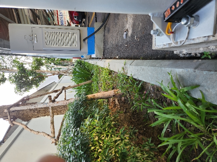 A grey metal utility box with a ventilation grille is positioned next to a curb. A black cable extends from the box. Adjacent to the box is a grey electrical component attached with bolts. Below, lush greenery and vegetation fill the space between the structure and a white wall. A rustic wooden structure supports the plants. The scene suggests an urban or suburban outdoor setting.