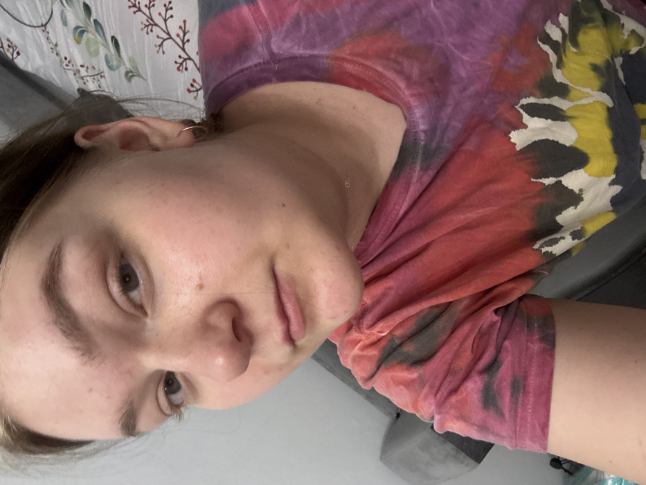 The image depicts an indoor scene within what appears to be a residential setting in Chaikovsky, Russia, though the precise location within the city is not identifiable. One individual, an adult female, is shown in a close-up, slightly angled portrait, occupying the majority of the frame. She has fair skin, exhibiting several minor blemishes on her forehead and cheeks, and a distinct mole on her right cheek. Her eyebrows are light brown, and her eyes are open with dark pupils. Her nose is broad, and her lips are closed, maintaining a neutral expression. Light brown hair is visible along the top and right side of her head. She is wearing a tie-dye t-shirt featuring a blend of red, purple, black, yellow, and white patterns. A small, gold-colored hoop earring is visible in her right earlobe, and a thin, light-colored chain necklace with a small, circular pendant rests on her neck. The individual is looking directly towards the camera, suggesting a self-portrait or direct photograph. The background consists of indistinct elements. To the viewer's left, a portion of a gray upholstered furniture item is visible. To the viewer's right and extending towards the top of the frame, a patterned fabric, possibly bedding, with repeating reddish-brown and white floral or leafy motifs on a lighter background, is present. The lighting is consistent with an interior artificial light source.