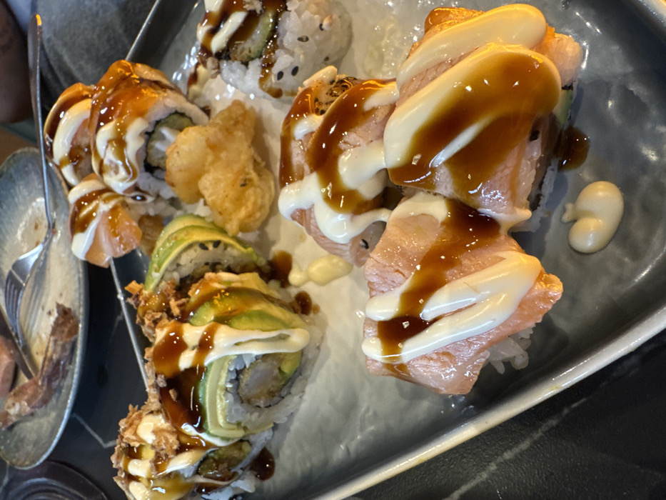 - "A close-up shot captures an assortment of sushi rolls and tempura pieces arranged on a grey rectangular plate" by FM-etByS2, licensed under CC BY 4.0