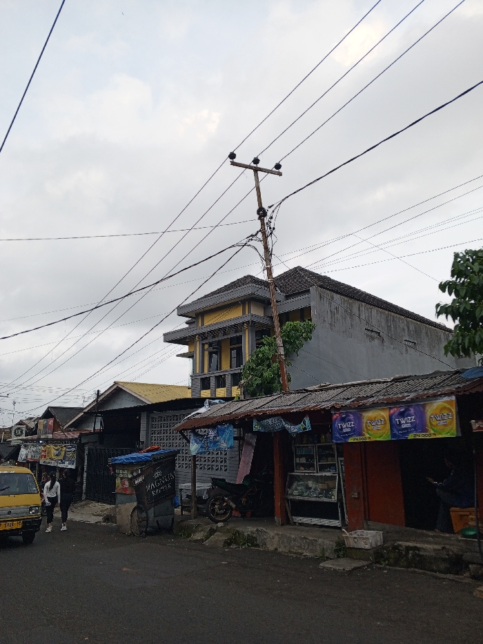 The image depicts a street scene in Voa Yeav, Cambodia, under an overcast sky. In the foreground, a dark asphalt road is visible. On the left side of the road, the front portion of a yellow utility van, possibly a Suzuki Carry, is parked or moving slowly, with a partially visible license plate ending in "JG0E 7D". Two individuals are walking on the road or sidewalk next to the van, moving away from the viewer; one is clearly visible wearing a white top and dark pants. To the right of the van, on the unpaved shoulder, a dark-colored pushcart with the text "MAGNUM PRETOR" is present. Behind this, a series of structures line the street. A prominent two-story building is centrally located, featuring a grey lower level and a yellow upper level with grey trim and a grey tile roof, equipped with multiple windows. Green foliage grows along its side. To its right, a single-story commercial structure with a weathered corrugated metal roof extends along the street. This structure has an open front displaying goods, and banners for "Twizz" products are hung beneath its roof. A dark-colored motorcycle is parked on an elevated concrete section in front of this commercial structure. Inside, a single individual is partially visible, seated. Overhead, numerous black electrical power lines crisscross the frame, connected to a wooden utility pole with multiple insulators standing prominently in the mid-ground. Other residential or commercial structures with various roof types and wall finishes are visible further down the street in the background.