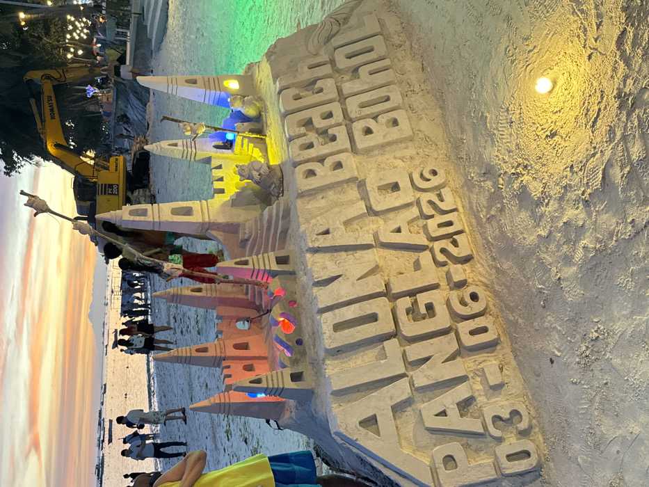 The image depicts a vibrant dusk scene at Alona Beach in Panglao, Bohol, Philippines, with an orange and pink sunset sky. The primary subject is a large, intricately carved sand sculpture in the foreground, shaped as a multi-turreted castle. This sculpture features internal lighting in pink, red, blue, yellow, and green, along with sculpted animal figures, one of which holds a stick. The side of the sculpture bears carved block letters stating "ALONA BEACH PANGLAO BOHOL 03-06-2026". A circular yellow light source illuminates the sand directly in front of the sculpture. The sandy beach is populated by numerous individuals walking and standing near the water's edge, with several boats visible on the calm sea in the background. To the right of the frame, a large yellow Komatsu PC 200 excavator is positioned on the beach. Further right, a concrete promenade runs parallel to the beach, lined with palm trees and various establishments illuminated by string lights and other artificial sources, where people are seen seated. A person wearing a yellow shirt and blue shorts is partially visible on the far left, adjacent to the sand sculpture. Footprints are discernible in the sand around the sculpture and extending towards the water.