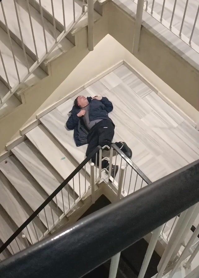 A high-angle shot shows a person lying on their back on a marble floor. The person is wearing a dark blue jacket, gray shirt, black pants, and black shoes with white soles. They also appear to be wearing a black beanie. They are lying on a landing between flights of stairs with white railings and black handrails. The stairs have a similar marble design as the landing. The person's eyes are closed, and their arm is across their chest.