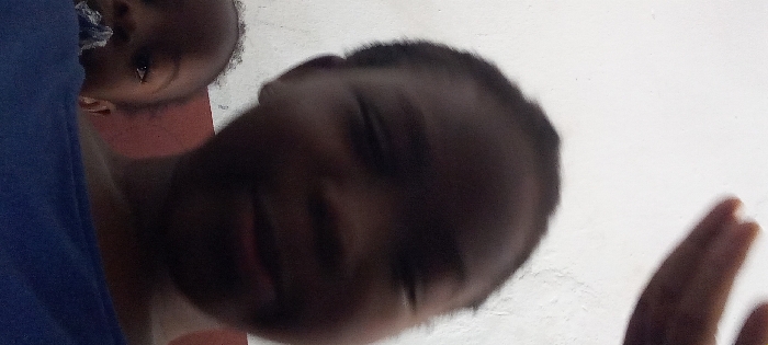 The image displays a low-angle, close-up view of two dark-skinned individuals within an indoor environment. In the foreground, a young person with short, dark hair wears a blue garment. Their face is largely blurred and partially obscured by shadow, with the mouth suggesting a slight upturn. Fingers, likely belonging to this individual, are visible in the upper right quadrant. Partially visible behind and to the left of the foreground subject is an infant, whose left eye is discernible and directed towards the right. A crumpled, light-colored object is positioned near the infant's nasal and oral region. The background consists of a plain, light-colored wall in the upper portion and a reddish-brown surface below it. The specific location within Ogbomosho, Nigeria, cannot be determined from the visual evidence.