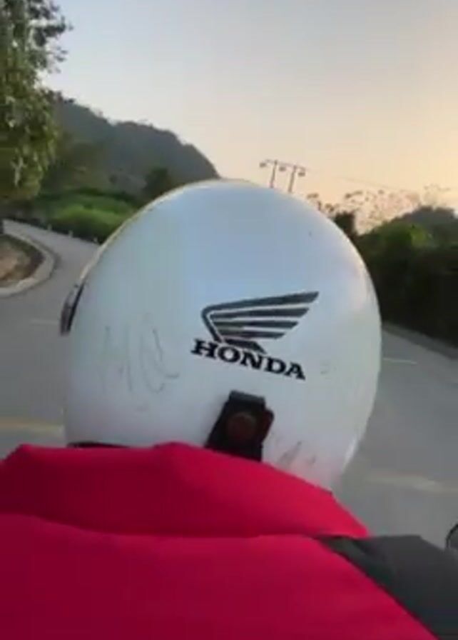 person riding a motorcycle on a winding road. The rider is wearing a white Honda helmet and a red and black jacket. The road is surrounded by trees and mountains in the distance. The sky is clear and blue, suggesting it is either early morning or late afternoon. The camera is positioned behind the rider, offering a point-of-view perspective of the journey. There are power lines visible on the right side of the road at one point.