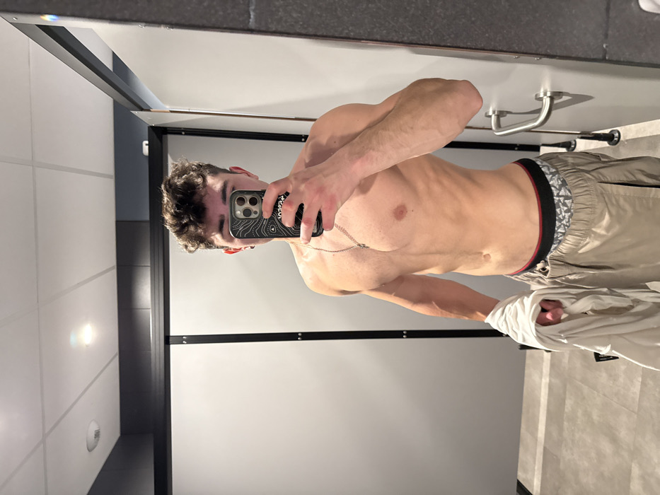 A male individual is depicted taking a mirror selfie within a locker room or changing facility in Chantepie, France