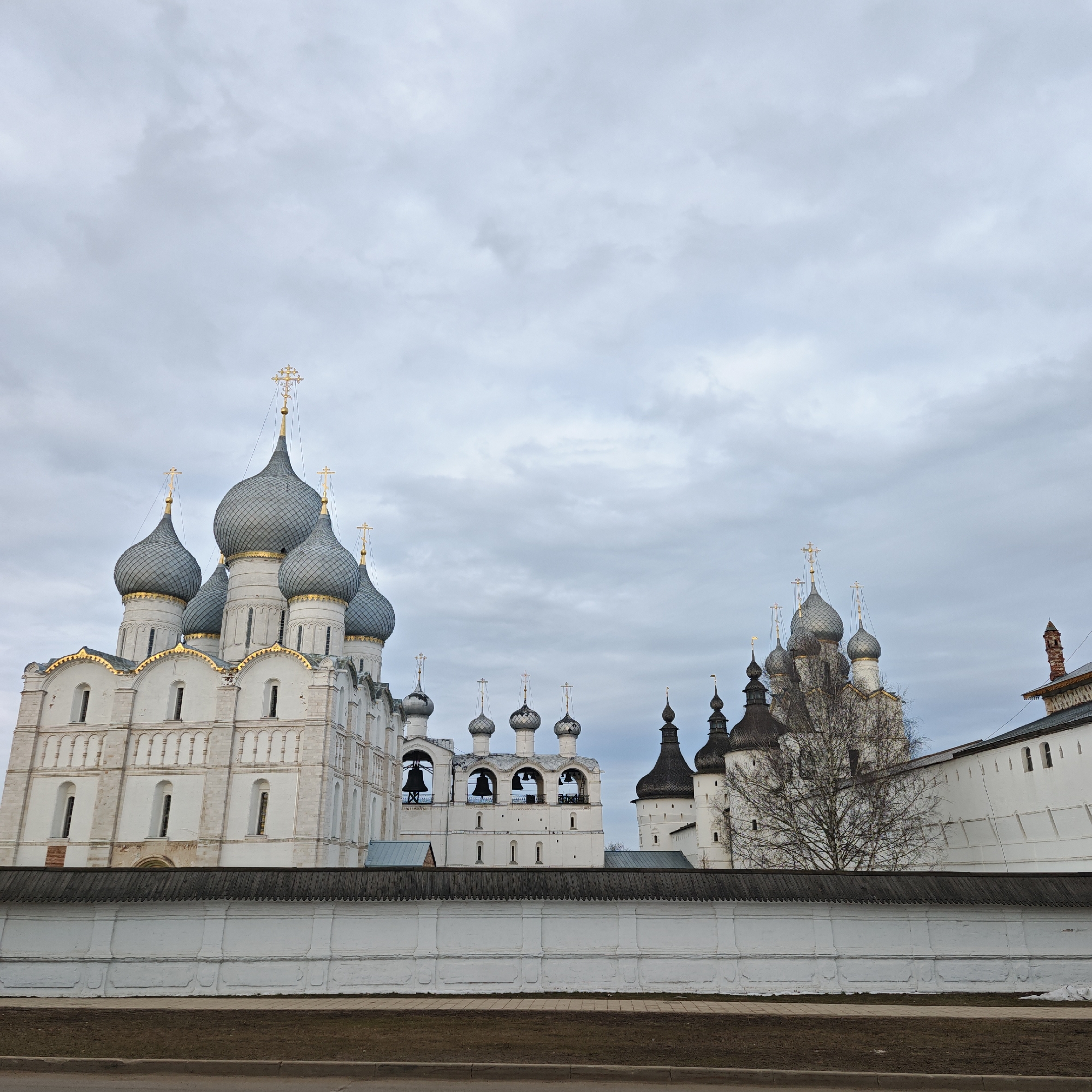 The image displays an architectural complex in Kladovitsy, Russia, under an overcast, light gray sky. In the foreground, a strip of dark, dormant earth or dry vegetation is visible, bordered by a concrete curb. Above this, a white, textured wall with a dark, horizontally slatted wooden coping extends across the mid-ground. Dominating the left side, a large, multi-domed cathedral-like structure is visible, constructed of white stone. It features five prominent, gray, onion-shaped domes, each topped with a golden Orthodox cross and a golden band at its base. The building's facade includes multiple tall, narrow arched windows and decorative relief patterns. To the right, a white bell tower is visible with three open archways, each housing a dark bell, topped by smaller gray domes and crosses. Further right, additional white buildings with dark, conical domes and a high defensive wall are present. A bare-branched tree is situated between these structures. No individuals, animals, or specific activities are observed.