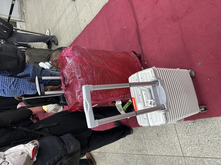 The image displays a collection of luggage. A large suitcase wrapped in red plastic dominates the scene, positioned next to a striped, white carry-on. People stand adjacent to the luggage, with only their lower bodies and accompanying bags visible. The floor transitions from a patterned tile to a solid red carpet. The luggage tags and handles are noticeable details.