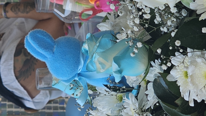 This image depicts a table setting at an event in San Bernardino Tlaxcalancingo, Mexico. In the foreground, a floral arrangement prominently features white chrysanthemums, light blue roses, and white baby's breath, interspersed with dark green foliage. Centered within the flowers is a small, plush blue bunny toy, adorned with a light blue satin ribbon tied into a bow. Behind the bunny, an empty, clear champagne flute is visible to the left, and to the right, a transparent plastic container holds small, colorful objects, including pink and orange miniature watering cans. In the background, a person is partially visible, wearing a white garment and exhibiting tattoos on both arms and the upper back/shoulder, one appearing to be a winged design. The person's hand, with pink fingernails, rests on a surface. The environment suggests an indoor setting with a shimmering, possibly tiled, reflective wall featuring a light blue and silver grid pattern.