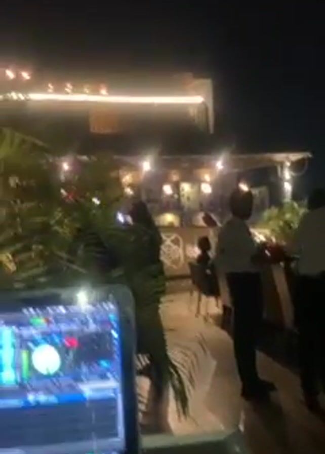 At night, the video captures a DJ, identifiable by the laptop and mixing board, spinning tunes at an outdoor bar. The bar itself is a multi-level structure, adorned with string lights and a bar logo, with patrons seated and standing around. There are plants adding a tropical vibe to the scene, and staff members can be seen working among the customers. The video is a bit shaky, suggesting it was taken by hand, and it looks up slightly to show the bar's structure.